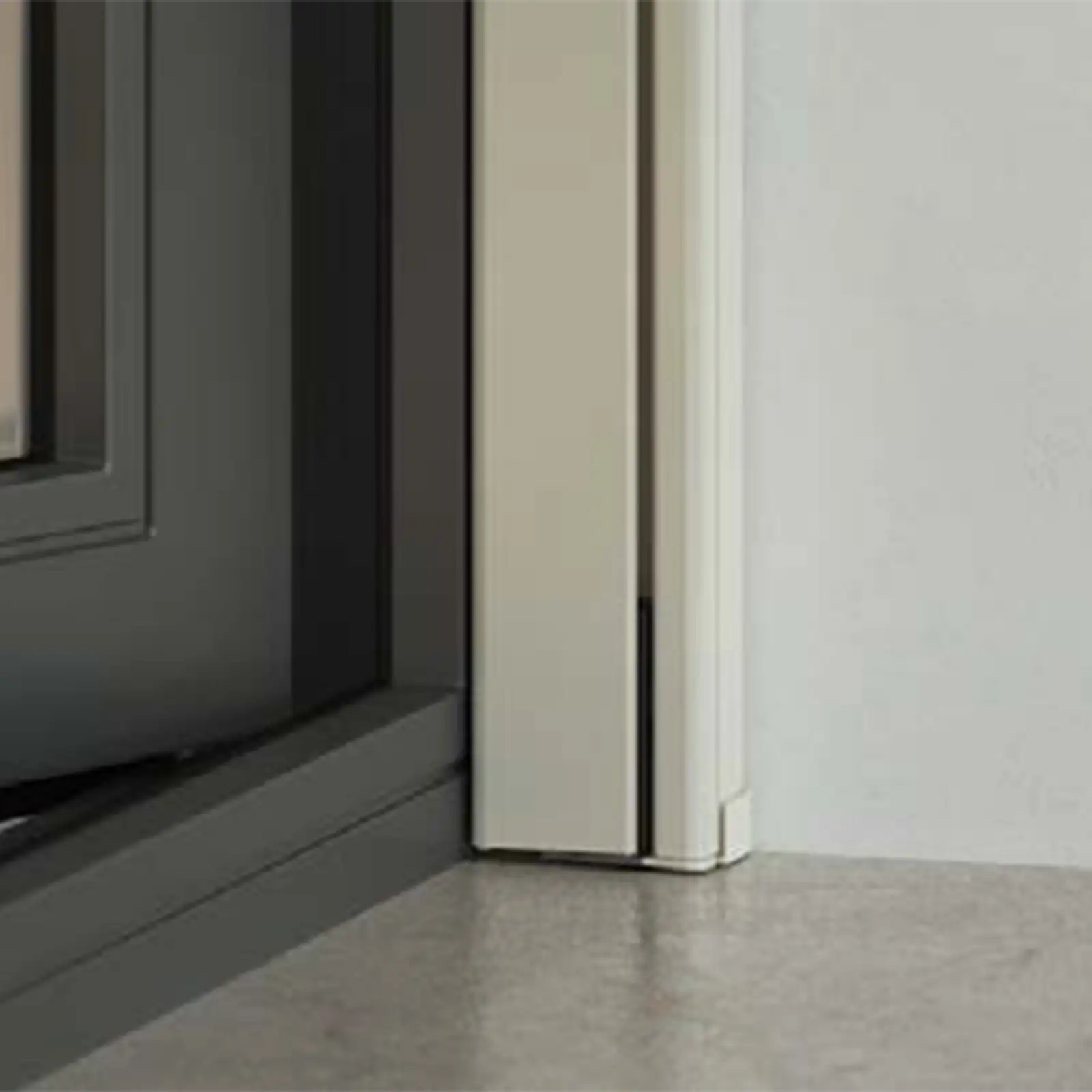 Dettaglio angolare della zanzariera Estetika Bettio anticimice con profili in alluminio e spazzolino inferiore. Zanzariera verticale a molla s...